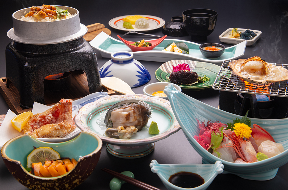 四季折々の新鮮な海の幸をたっぷりと満足満喫!『漣-れん』コース 霊場金華山沖と周辺近海は好漁場として知られています。 ・鮑の陶板焼き ・鮑のお造り ・鯨料理逸品 ・海鮮釜飯 ・三陸産のお造り ・水菓子 等、牡鹿半島の美味を贅沢に取り入れました。